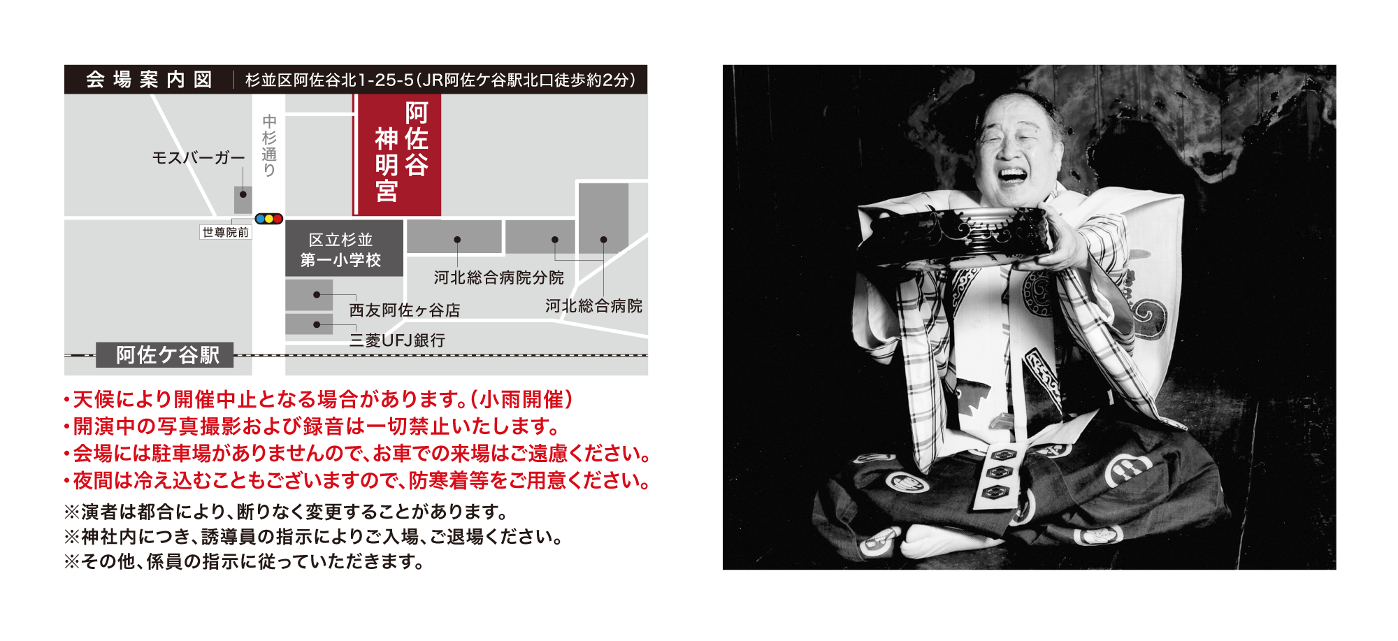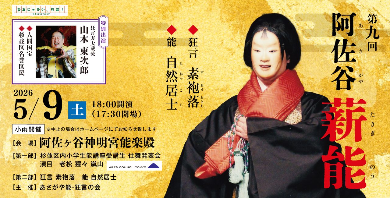 本公演は、地元有志により構成された実行委員会「あさがや能・狂言の会」が主催しています。同会は2017年(平成29年)に発足し、日本の古典芸能である能・狂言に触れる機会を地域につくることを目的として活動してきました。伝統文化に内在する精神性や美意識を地域で共有することを通じ、教育的・文化的な側面から地域に寄与することを活動の趣旨としています。